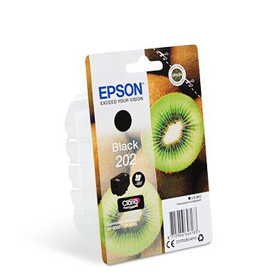 Epson Kiwi Singlepack Black 202 Claria Premium Ink. Typ: Original, Tintentyp: Tinte auf Pigmentbasis, Druckfarben: Schwarz. Verpackungsbreite: 142 mm, Verpackungstiefe: 92 mm, Verpackungshöhe: 47 mm. Palettenbreite: 80 cm, Palettenlänge: 120 cm, Palettenhöhe: 2 mSenken Sie Ihre Druckkosten