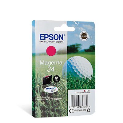 Epson Golf ball Singlepack Magenta 34 DURABrite Ultra Ink. Typ: Original, Tintentyp: Tinte auf Pigmentbasis, Druckfarben: Magenta. Verpackungsbreite: 146 mm, Verpackungstiefe: 260 mm, Verpackungshöhe: 100 mm. Palettenbreite: 80 cm, Palettenlänge: 120 cm, Palettenhöhe: 2 mDruckkosten senken
