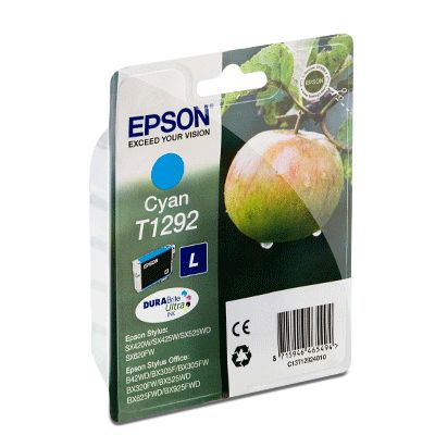 Epson Singlepack Cyan T1292 DURABrite Ultra Ink. Typ: Original, Druckfarben: Cyan, Markenkompatibilität: Epson. Verpackungsbreite: 145 mm, Verpackungstiefe: 26 mm, Verpackungshöhe: 102 mm. Palettenbreite: 80 cm, Palettenlänge: 120 cm, Palettenhöhe: 15 cmGeld sparen mit separaten Einzelpatronen